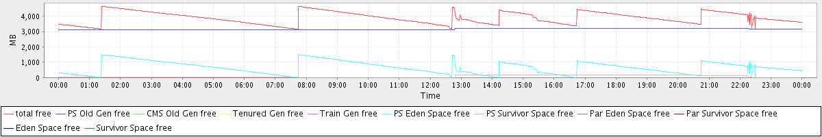 avg(total free) = 3891.39 avg(PS Old Gen free) = 3162.03 avg(CMS Old Gen free) = 0.00 avg(Tenured Gen free) = 0.00 avg(Train Gen free) = 0.00 avg(PS Eden Space free) = 655.35 avg(PS Survivor Space free) = 74.01 avg(Par Eden Space free) = 0.00 avg(Par Survivor Space free) = 0.00 avg(Eden Space free) = 0.00 avg(Survivor Space free) = 0.00