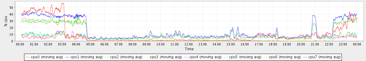 avg(cpu0) = 2.31 avg(cpu1) = 2.02 avg(cpu2) = 1.61 avg(cpu3) = 0.86 avg(cpu4) = 0.71 avg(cpu5) = 0.79 avg(cpu6) = 1.47 avg(cpu7) = 0.80