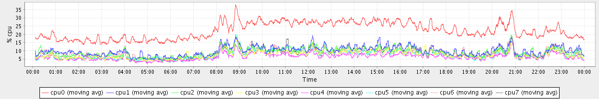 avg(cpu0) = 22.30 avg(cpu1) = 9.83 avg(cpu2) = 9.20 avg(cpu3) = 7.86 avg(cpu4) = 6.35 avg(cpu5) = 7.79 avg(cpu6) = 8.72 avg(cpu7) = 7.69