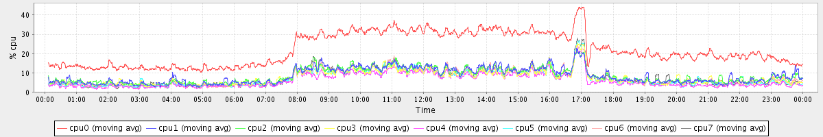 avg(cpu0) = 21.97 avg(cpu1) = 8.35 avg(cpu2) = 8.35 avg(cpu3) = 7.58 avg(cpu4) = 6.02 avg(cpu5) = 7.21 avg(cpu6) = 7.44 avg(cpu7) = 7.42