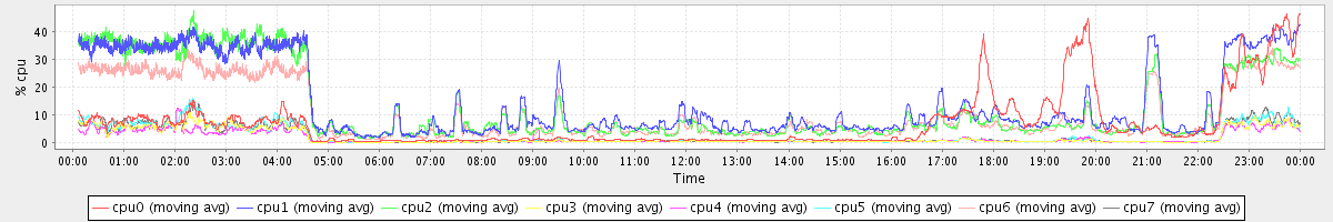 avg(cpu0) = 7.03 avg(cpu1) = 14.57 avg(cpu2) = 12.92 avg(cpu3) = 1.88 avg(cpu4) = 1.59 avg(cpu5) = 2.24 avg(cpu6) = 10.54 avg(cpu7) = 2.17