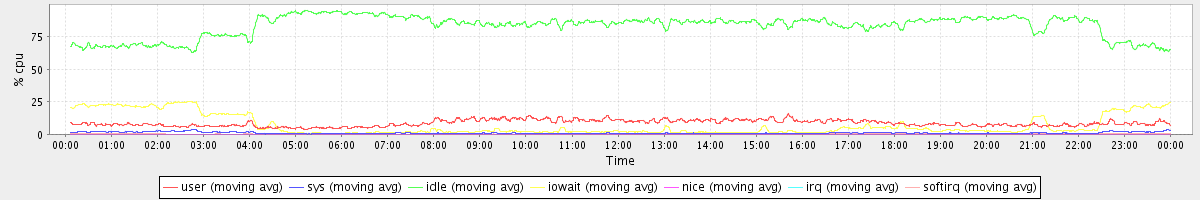 avg(user) = 8.60 avg(sys) = 1.09 avg(idle) = 83.03 avg(iowait) = 6.90 avg(nice) = 0.00 avg(irq) = 0.05 avg(softirq) = 0.34