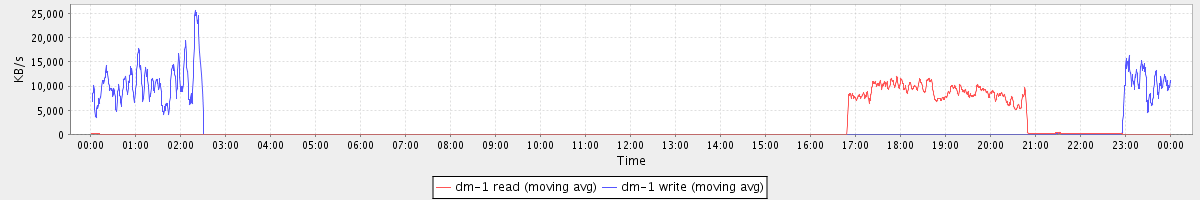 avg(dm-1 read) = 14.44 avg(dm-1 write) = 389.51