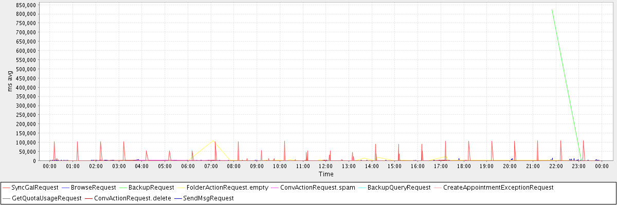 avg(SyncGalRequest) = 3750.39 avg(BrowseRequest) = 401.00 avg(BackupRequest) = 412314.50 avg(FolderActionRequest.empty) = 5553.25 avg(ConvActionRequest.spam) = 227.56 avg(BackupQueryRequest) = 526.20 avg(CreateAppointmentExceptionRequest) = 290.33 avg(GetQuotaUsageRequest) = 3202.00 avg(ConvActionRequest.delete) = 400.08 avg(SendMsgRequest) = 393.76