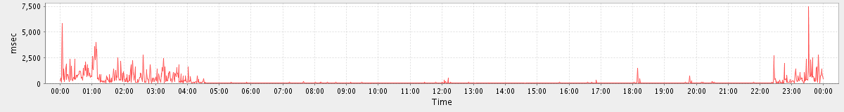 avg(SyncGalRequest) = 642.49 avg(SendInviteReplyRequest) = 1803.00 avg(BrowseRequest) = 697.00 avg(GetQuotaUsageRequest) = 3150.00 avg(ConvActionRequest.delete) = 1114.15 avg(DeleteAccountRequest) = 44874.00 avg(SetAppointmentRequest) = 916.86 avg(SendMsgRequest) = 671.05 avg(BackupRequest) = 497354.00 avg(FolderActionRequest.empty) = 8293.48