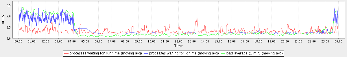 avg(processes waiting for run time) = 0.59 avg(processes waiting for io time) = 1.01 avg(load average (1 min)) = 1.80