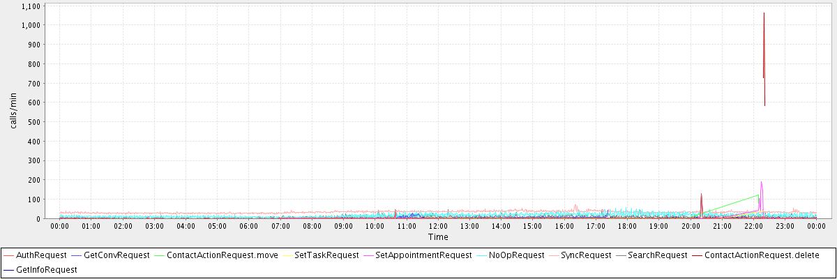max(AuthRequest) = 121.00 max(GetConvRequest) = 41.00 max(ContactActionRequest.move) = 121.00 max(SetTaskRequest) = 38.00 max(SetAppointmentRequest) = 191.00 max(NoOpRequest) = 56.00 max(SyncRequest) = 72.00 max(SearchRequest) = 131.00 max(ContactActionRequest.delete) = 1062.00 max(GetInfoRequest) = 122.00