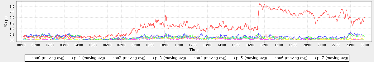 avg(cpu0) = 1.26 avg(cpu1) = 0.26 avg(cpu2) = 0.21 avg(cpu3) = 0.09 avg(cpu4) = 0.05 avg(cpu5) = 0.07 avg(cpu6) = 0.18 avg(cpu7) = 0.07