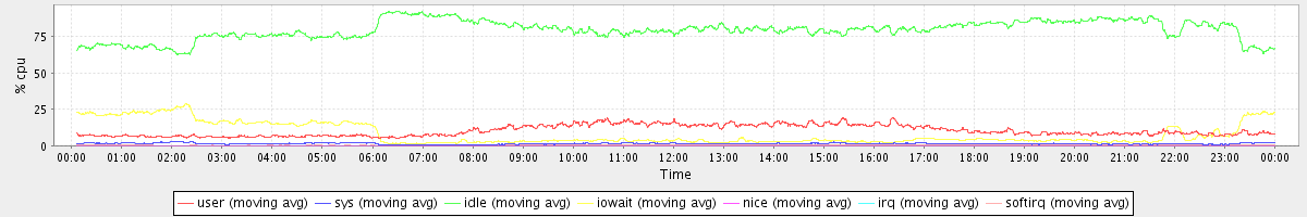 avg(user) = 10.30 avg(sys) = 1.43 avg(idle) = 79.74 avg(iowait) = 8.06 avg(nice) = 0.00 avg(irq) = 0.06 avg(softirq) = 0.42