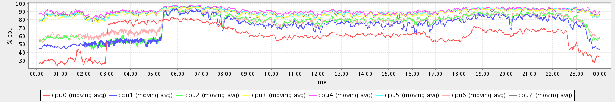 avg(cpu0) = 60.04 avg(cpu1) = 71.26 avg(cpu2) = 75.45 avg(cpu3) = 87.57 avg(cpu4) = 90.65 avg(cpu5) = 88.93 avg(cpu6) = 76.95 avg(cpu7) = 88.73