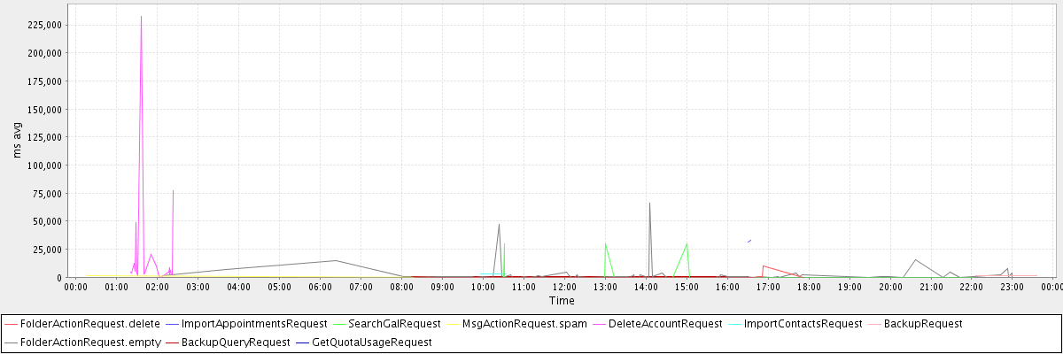 avg(FolderActionRequest.delete) = 830.00 avg(ImportAppointmentsRequest) = 32182.50 avg(SearchGalRequest) = 1266.07 avg(MsgActionRequest.spam) = 595.67 avg(DeleteAccountRequest) = 18962.72 avg(ImportContactsRequest) = 2984.00 avg(BackupRequest) = 1222.00 avg(FolderActionRequest.empty) = 2601.48 avg(BackupQueryRequest) = 779.00 avg(GetQuotaUsageRequest) = 3272.00