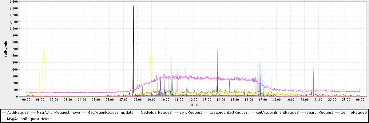 max(AuthRequest) = 403.00 max(MsgActionRequest.move) = 282.00 max(MsgActionRequest.update) = 595.00 max(GetFolderRequest) = 695.00 max(SyncRequest) = 447.00 max(CreateContactRequest) = 484.00 max(GetAppointmentRequest) = 461.00 max(SearchRequest) = 420.00 max(GetInfoRequest) = 405.00 max(MsgActionRequest.delete) = 1336.00