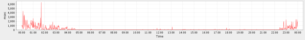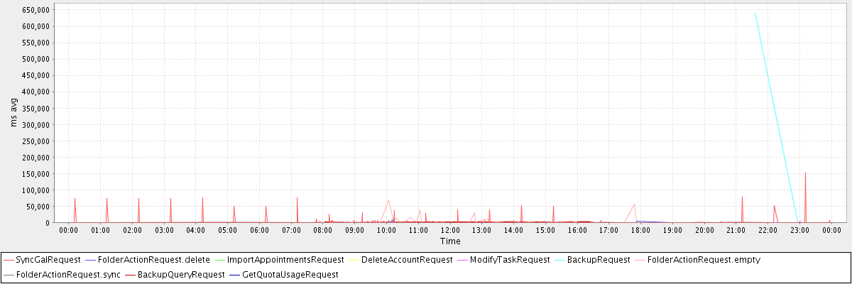 avg(SyncGalRequest) = 1240.48 avg(FolderActionRequest.delete) = 1050.00 avg(ImportAppointmentsRequest) = 795.00 avg(DeleteAccountRequest) = 12118.00 avg(ModifyTaskRequest) = 734.50 avg(BackupRequest) = 320696.00 avg(FolderActionRequest.empty) = 4399.75 avg(FolderActionRequest.sync) = 4476.00 avg(BackupQueryRequest) = 899.40 avg(GetQuotaUsageRequest) = 3317.00
