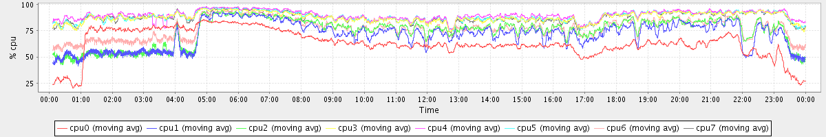 avg(cpu0) = 24.23 avg(cpu1) = 10.93 avg(cpu2) = 9.89 avg(cpu3) = 8.83 avg(cpu4) = 7.20 avg(cpu5) = 7.95 avg(cpu6) = 9.85 avg(cpu7) = 8.79