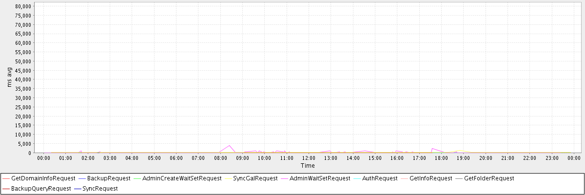 avg(GetDomainInfoRequest) = 3.72 avg(BackupRequest) = 78373.00 avg(AdminCreateWaitSetRequest) = 1.50 avg(SyncGalRequest) = 161.52 avg(AdminWaitSetRequest) = 20.56 avg(AuthRequest) = 25.25 avg(GetInfoRequest) = 7.67 avg(GetFolderRequest) = 9.33 avg(BackupQueryRequest) = 198.00 avg(SyncRequest) = 1.51