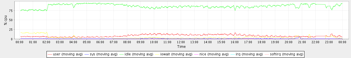 avg(user) = 8.33 avg(sys) = 0.90 avg(idle) = 86.53 avg(iowait) = 3.97 avg(nice) = 0.00 avg(irq) = 0.02 avg(softirq) = 0.24