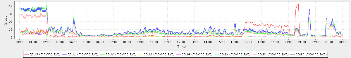 avg(cpu0) = 1.77 avg(cpu1) = 1.30 avg(cpu2) = 1.12 avg(cpu3) = 0.63 avg(cpu4) = 0.51 avg(cpu5) = 0.50 avg(cpu6) = 0.88 avg(cpu7) = 0.47