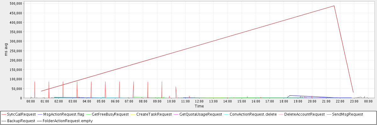 avg(SyncGalRequest) = 1531.12 avg(MsgActionRequest.flag) = 507.50 avg(GetFreeBusyRequest) = 1003.27 avg(CreateTaskRequest) = 409.75 avg(GetQuotaUsageRequest) = 3416.00 avg(ConvActionRequest.delete) = 338.93 avg(DeleteAccountRequest) = 11047.00 avg(SendMsgRequest) = 389.53 avg(BackupRequest) = 184191.33 avg(FolderActionRequest.empty) = 1627.87