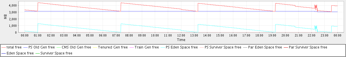 avg(total free) = 3738.25 avg(PS Old Gen free) = 3120.84 avg(CMS Old Gen free) = 0.00 avg(Tenured Gen free) = 0.00 avg(Train Gen free) = 0.00 avg(PS Eden Space free) = 616.41 avg(PS Survivor Space free) = 1.01 avg(Par Eden Space free) = 0.00 avg(Par Survivor Space free) = 0.00 avg(Eden Space free) = 0.00 avg(Survivor Space free) = 0.00