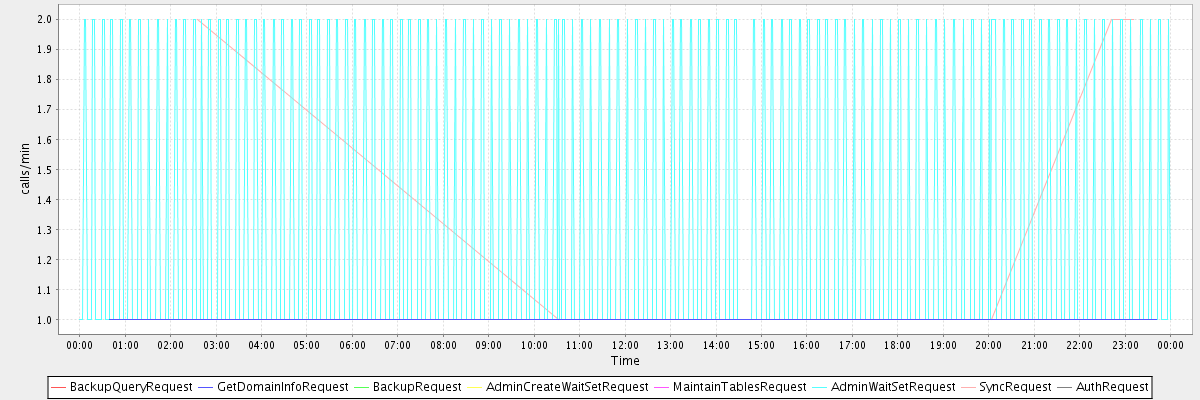 max(BackupQueryRequest) = 1.00 max(GetDomainInfoRequest) = 1.00 max(BackupRequest) = 1.00 max(AdminCreateWaitSetRequest) = 1.00 max(MaintainTablesRequest) = 1.00 max(AdminWaitSetRequest) = 2.00 max(SyncRequest) = 2.00 max(AuthRequest) = 1.00