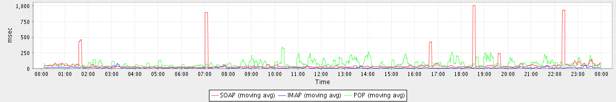 max(GetMsgRequest) = 275.00 max(GetAppointmentRequest) = 273.00 max(SearchRequest) = 64.00 max(SearchConvRequest) = 21.00 max(MsgActionRequest.move) = 64.00 max(MsgActionRequest.delete) = 124.00 max(ConvActionRequest.trash) = 16.00 max(NoOpRequest) = 58.00 max(GetFolderRequest) = 39.00 max(SyncRequest) = 96.00