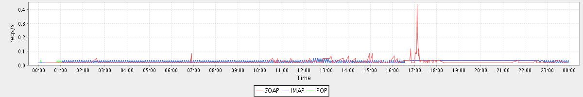 max(AdminWaitSetRequest) = 3.00 max(GetInfoRequest) = 2.00 max(GetAccountRequest) = 11.00 max(GetDomainInfoRequest) = 3.00 max(NoOpRequest) = 2.00 max(ModifyAccountRequest) = 7.00 max(AuthRequest) = 2.00 max(SearchRequest) = 3.00 max(GetFolderRequest) = 5.00 max(SyncRequest) = 3.00