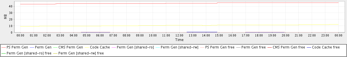 avg(PS Perm Gen) = 44.59 avg(Perm Gen) = 0.00 avg(CMS Perm Gen) = 0.00 avg(Code Cache) = 10.60 avg(Perm Gen [shared-ro]) = 0.00 avg(Perm Gen [shared-rw]) = 0.00 avg(PS Perm Gen free) = 0.10 avg(Perm Gen free) = 0.00 avg(CMS Perm Gen free) = 0.00 avg(Code Cache free) = 0.08 avg(Perm Gen [shared-ro] free) = 0.00 avg(Perm Gen [shared-rw] free) = 0.00