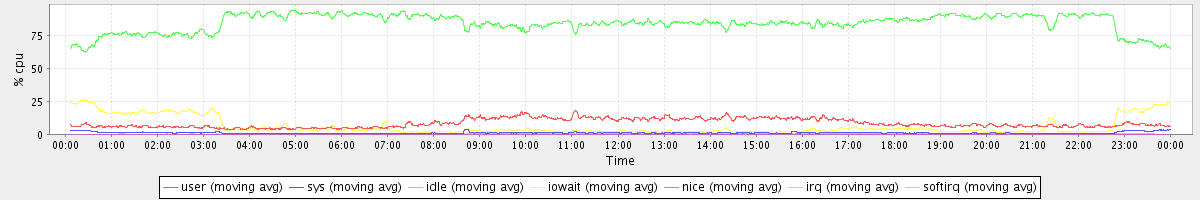 avg(user) = 8.40 avg(sys) = 1.11 avg(idle) = 84.15 avg(iowait) = 6.01 avg(nice) = 0.00 avg(irq) = 0.04 avg(softirq) = 0.29