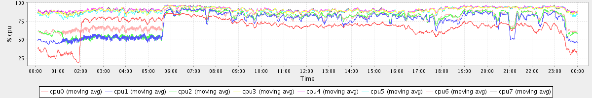 avg(cpu0) = 67.51 avg(cpu1) = 73.51 avg(cpu2) = 76.62 avg(cpu3) = 90.37 avg(cpu4) = 91.42 avg(cpu5) = 89.99 avg(cpu6) = 79.12 avg(cpu7) = 90.92