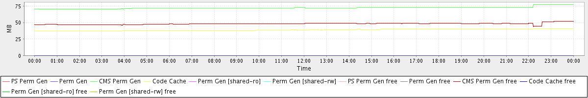 avg(PS Perm Gen) = 0.00 avg(Perm Gen) = 0.00 avg(CMS Perm Gen) = 72.29 avg(Code Cache) = 38.86 avg(Perm Gen [shared-ro]) = 0.00 avg(Perm Gen [shared-rw]) = 0.00 avg(PS Perm Gen free) = 0.00 avg(Perm Gen free) = 0.00 avg(CMS Perm Gen free) = 48.20 avg(Code Cache free) = 0.10 avg(Perm Gen [shared-ro] free) = 0.00 avg(Perm Gen [shared-rw] free) = 0.00