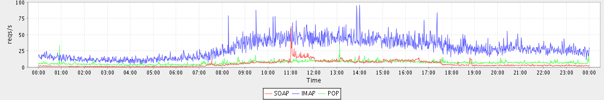 Host zm02.stanford.edu: Mailboxd: Request Rate by Client Protocol