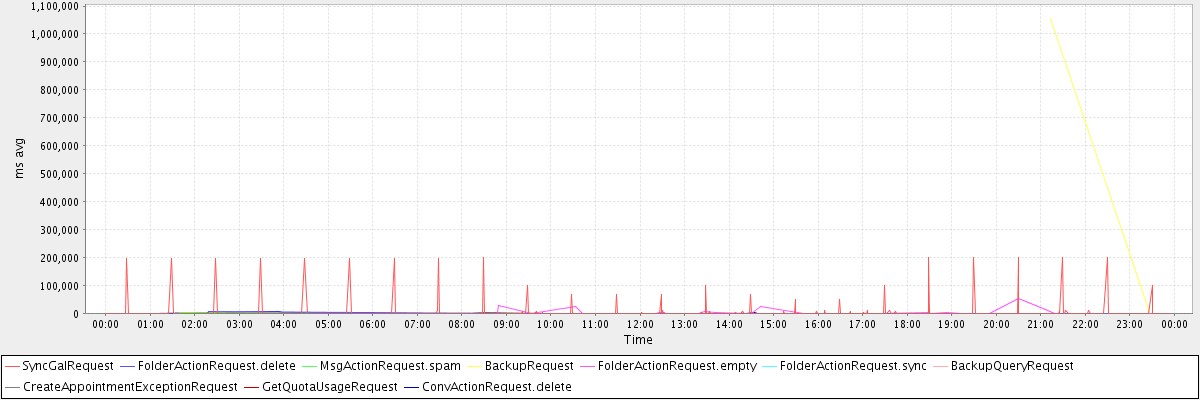 avg(SyncGalRequest) = 4428.60 avg(FolderActionRequest.delete) = 497.08 avg(MsgActionRequest.spam) = 638.67 avg(BackupRequest) = 528508.50 avg(FolderActionRequest.empty) = 4506.31 avg(FolderActionRequest.sync) = 3106.00 avg(BackupQueryRequest) = 637.40 avg(CreateAppointmentExceptionRequest) = 446.81 avg(GetQuotaUsageRequest) = 3231.00 avg(ConvActionRequest.delete) = 502.65