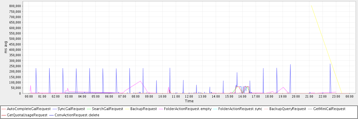 avg(AutoCompleteGalRequest) = 2909.24 avg(SyncGalRequest) = 8341.44 avg(SearchGalRequest) = 6212.79 avg(BackupRequest) = 403027.00 avg(FolderActionRequest.empty) = 8285.50 avg(FolderActionRequest.sync) = 6956.00 avg(BackupQueryRequest) = 624.00 avg(GetMiniCalRequest) = 419.86 avg(GetQuotaUsageRequest) = 3233.00 avg(ConvActionRequest.delete) = 367.19