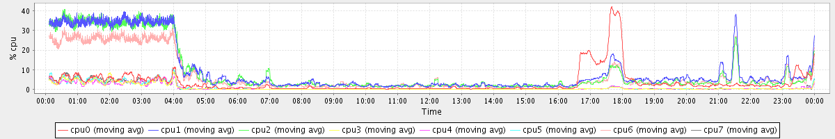 avg(cpu0) = 1.57 avg(cpu1) = 1.14 avg(cpu2) = 1.04 avg(cpu3) = 0.48 avg(cpu4) = 0.39 avg(cpu5) = 0.37 avg(cpu6) = 0.75 avg(cpu7) = 0.33