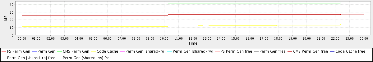 avg(PS Perm Gen) = 0.00 avg(Perm Gen) = 0.00 avg(CMS Perm Gen) = 40.84 avg(Code Cache) = 12.19 avg(Perm Gen [shared-ro]) = 0.00 avg(Perm Gen [shared-rw]) = 0.00 avg(PS Perm Gen free) = 0.00 avg(Perm Gen free) = 0.00 avg(CMS Perm Gen free) = 26.55 avg(Code Cache free) = 0.13 avg(Perm Gen [shared-ro] free) = 0.00 avg(Perm Gen [shared-rw] free) = 0.00