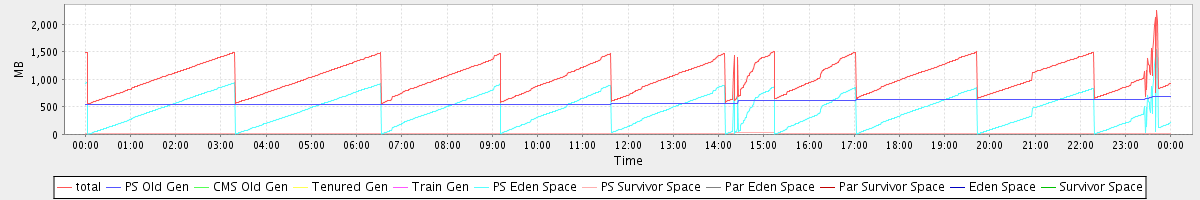 avg(total) = 1031.92 avg(PS Old Gen) = 579.03 avg(CMS Old Gen) = 0.00 avg(Tenured Gen) = 0.00 avg(Train Gen) = 0.00 avg(PS Eden Space) = 434.77 avg(PS Survivor Space) = 18.11 avg(Par Eden Space) = 0.00 avg(Par Survivor Space) = 0.00 avg(Eden Space) = 0.00 avg(Survivor Space) = 0.00