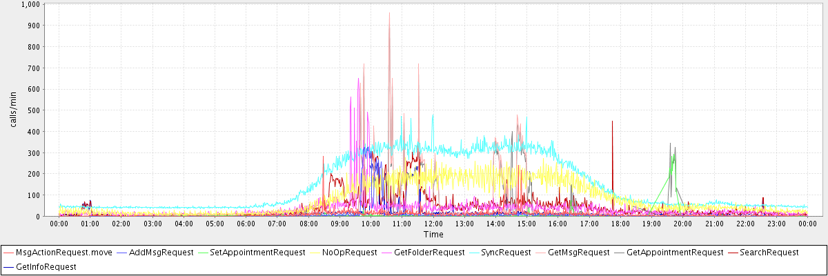max(MsgActionRequest.move) = 283.00 max(AddMsgRequest) = 326.00 max(SetAppointmentRequest) = 292.00 max(NoOpRequest) = 276.00 max(GetFolderRequest) = 650.00 max(SyncRequest) = 478.00 max(GetMsgRequest) = 959.00 max(GetAppointmentRequest) = 915.00 max(SearchRequest) = 450.00 max(GetInfoRequest) = 250.00