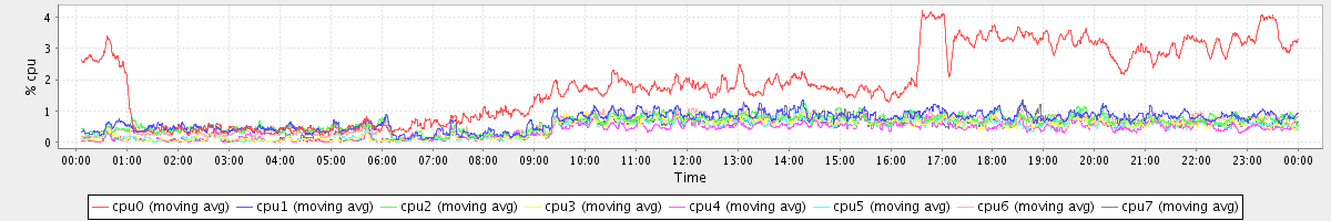 avg(cpu0) = 1.85 avg(cpu1) = 0.68 avg(cpu2) = 0.61 avg(cpu3) = 0.46 avg(cpu4) = 0.37 avg(cpu5) = 0.43 avg(cpu6) = 0.57 avg(cpu7) = 0.46
