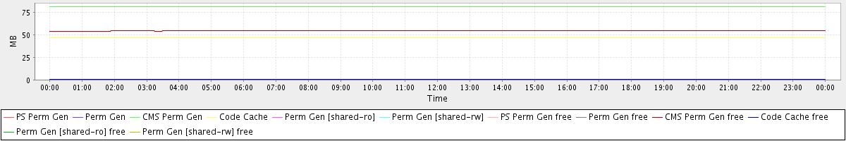 avg(PS Perm Gen) = 0.00 avg(Perm Gen) = 0.00 avg(CMS Perm Gen) = 81.19 avg(Code Cache) = 47.08 avg(Perm Gen [shared-ro]) = 0.00 avg(Perm Gen [shared-rw]) = 0.00 avg(PS Perm Gen free) = 0.00 avg(Perm Gen free) = 0.00 avg(CMS Perm Gen free) = 54.44 avg(Code Cache free) = 0.61 avg(Perm Gen [shared-ro] free) = 0.00 avg(Perm Gen [shared-rw] free) = 0.00