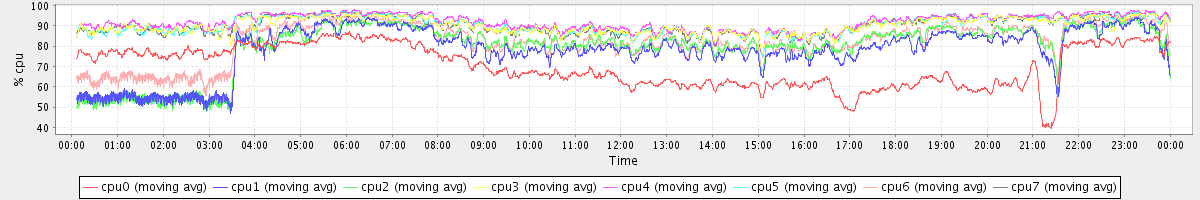 avg(cpu0) = 70.01 avg(cpu1) = 77.86 avg(cpu2) = 79.59 avg(cpu3) = 90.10 avg(cpu4) = 91.70 avg(cpu5) = 90.39 avg(cpu6) = 82.14 avg(cpu7) = 90.19