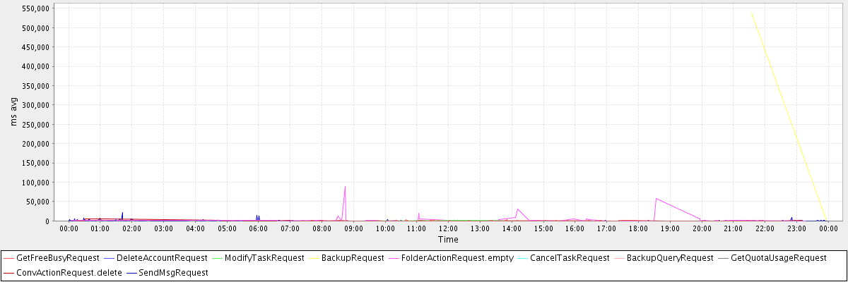 avg(GetFreeBusyRequest) = 263.74 avg(DeleteAccountRequest) = 2869.67 avg(ModifyTaskRequest) = 298.00 avg(BackupRequest) = 269743.00 avg(FolderActionRequest.empty) = 4449.53 avg(CancelTaskRequest) = 628.00 avg(BackupQueryRequest) = 746.20 avg(GetQuotaUsageRequest) = 3311.00 avg(ConvActionRequest.delete) = 468.03 avg(SendMsgRequest) = 317.40