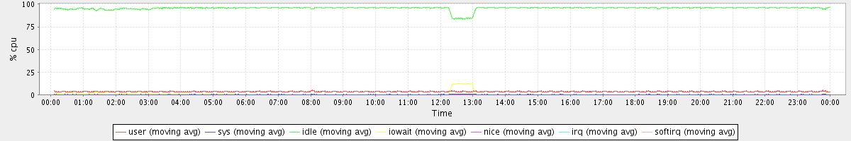 avg(user) = 3.45 avg(sys) = 0.26 avg(idle) = 95.59 avg(iowait) = 0.69 avg(nice) = 0.00 avg(irq) = 0.00 avg(softirq) = 0.00