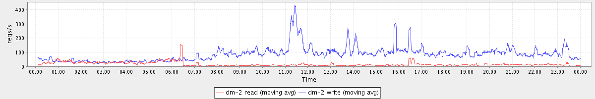 avg(dm-1 read) = 38.43 avg(dm-1 write) = 697.79