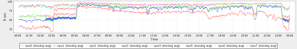 avg(cpu0) = 64.99 avg(cpu1) = 75.96 avg(cpu2) = 78.52 avg(cpu3) = 91.12 avg(cpu4) = 92.45 avg(cpu5) = 90.76 avg(cpu6) = 80.93 avg(cpu7) = 91.74