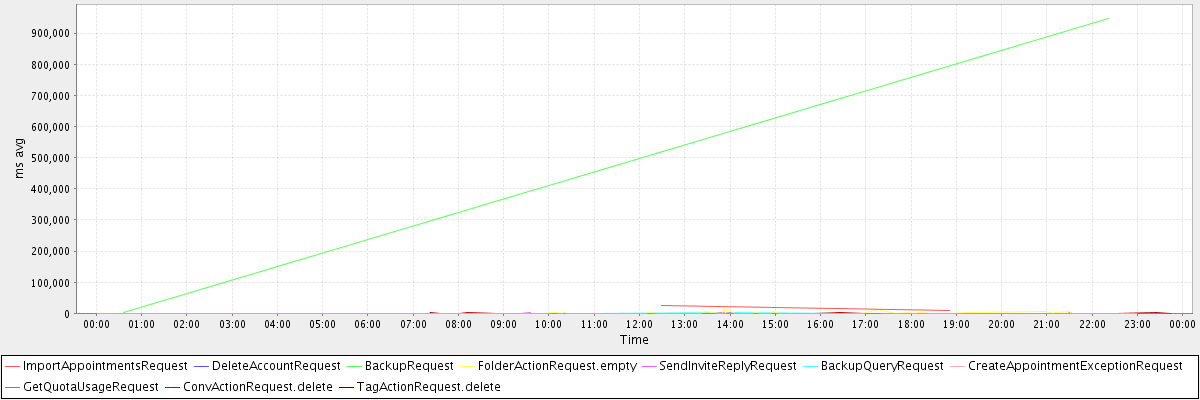 avg(ImportAppointmentsRequest) = 18434.50 avg(DeleteAccountRequest) = 74478.00 avg(BackupRequest) = 474030.50 avg(FolderActionRequest.empty) = 1379.23 avg(SendInviteReplyRequest) = 441.77 avg(BackupQueryRequest) = 911.60 avg(CreateAppointmentExceptionRequest) = 358.89 avg(GetQuotaUsageRequest) = 3314.00 avg(ConvActionRequest.delete) = 473.94 avg(TagActionRequest.delete) = 714.00