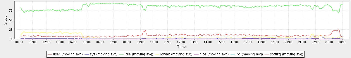 avg(user) = 8.83 avg(sys) = 1.02 avg(idle) = 84.43 avg(iowait) = 5.42 avg(nice) = 0.00 avg(irq) = 0.04 avg(softirq) = 0.27