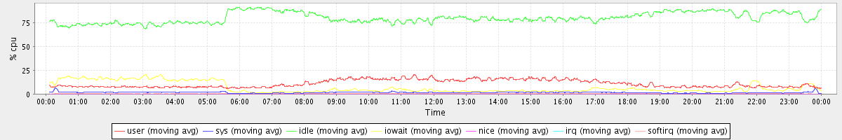 avg(user) = 10.90 avg(sys) = 1.62 avg(idle) = 80.29 avg(iowait) = 6.68 avg(nice) = 0.00 avg(irq) = 0.06 avg(softirq) = 0.46