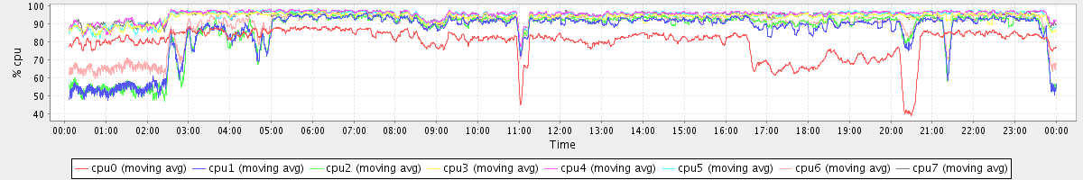 avg(cpu0) = 80.02 avg(cpu1) = 85.88 avg(cpu2) = 86.52 avg(cpu3) = 93.70 avg(cpu4) = 95.32 avg(cpu5) = 94.71 avg(cpu6) = 89.12 avg(cpu7) = 94.77