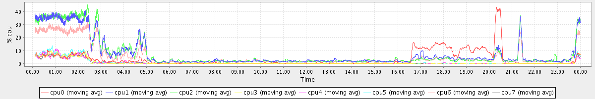 avg(cpu0) = 14.36 avg(cpu1) = 5.44 avg(cpu2) = 4.86 avg(cpu3) = 4.92 avg(cpu4) = 3.43 avg(cpu5) = 3.88 avg(cpu6) = 4.79 avg(cpu7) = 4.07