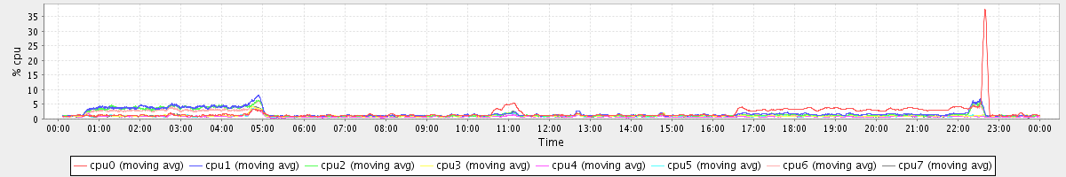 avg(cpu0) = 1.31 avg(cpu1) = 0.60 avg(cpu2) = 0.54 avg(cpu3) = 0.42 avg(cpu4) = 0.28 avg(cpu5) = 0.40 avg(cpu6) = 0.50 avg(cpu7) = 0.41